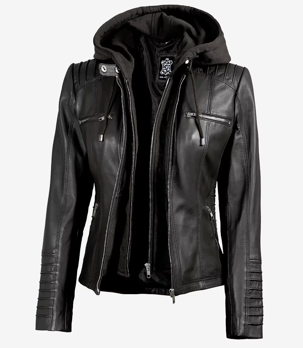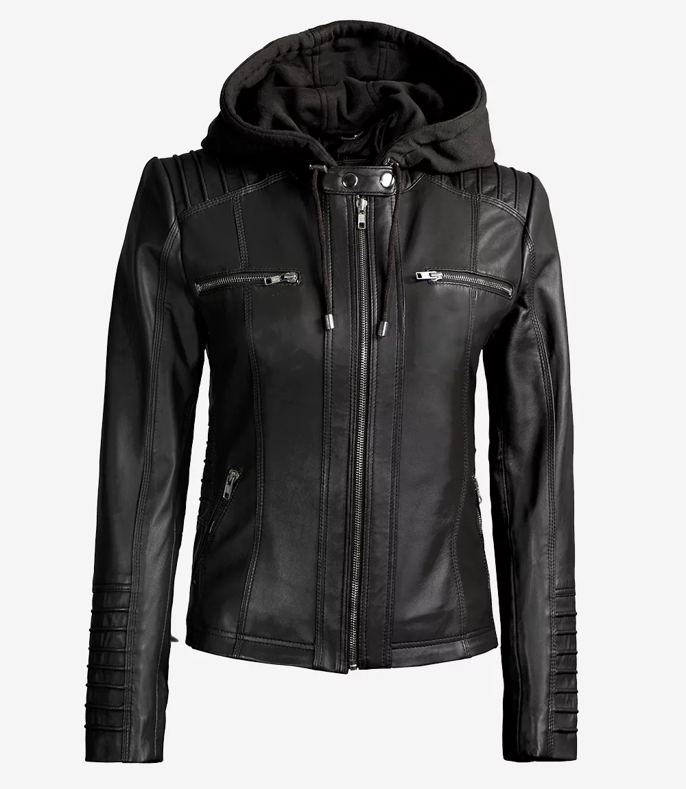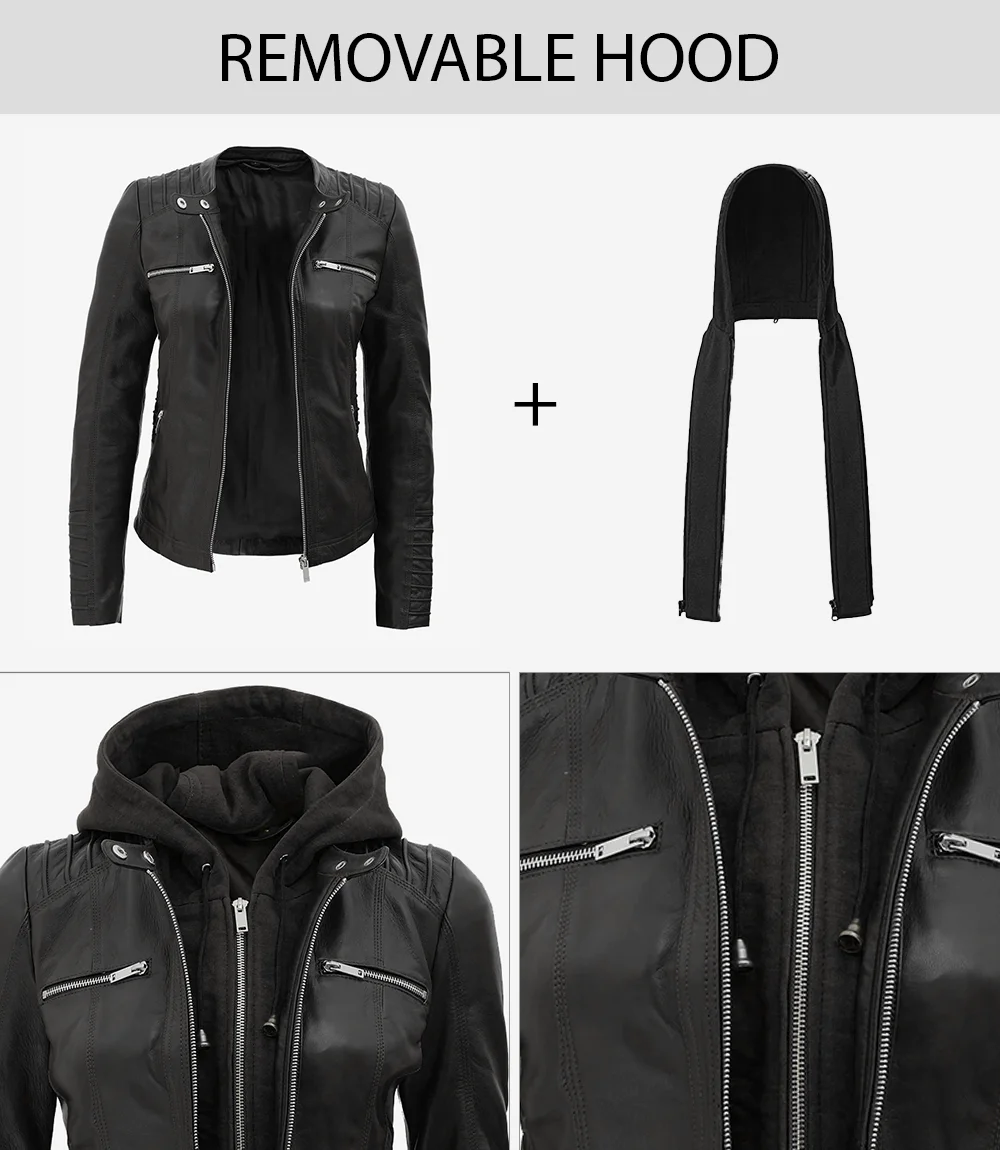 Stay snug yet trendy in this warm and comfortable black leather jacket with a hood.